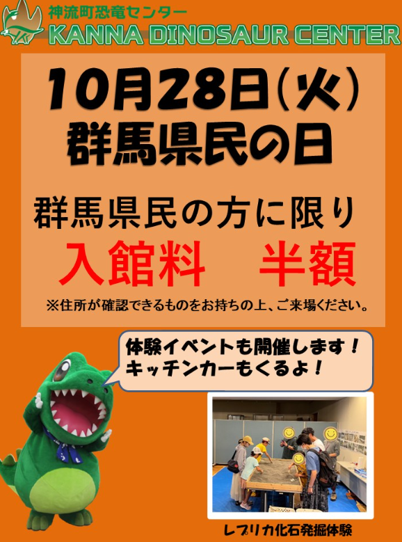 群馬県民の日情報(恐竜センター) 更新日:2025年10月20日 ページID: 1292 群馬県民の日、10/28(火曜日)は群馬県に住所がある方の入場料が半額となります。(団体割引、モンベル割引等の他割引との併用はできません。) 予約なしでできる「レプリカ化石発掘体験」も開催します。 キッチンカーも出店予定です。('◇')ゞ この記事に関するお問い合わせ先 神流町恐竜センター群馬県多野郡神流町大字神ヶ原51-2電話:0274-58-2829HP:https://dino-nakasato.org/